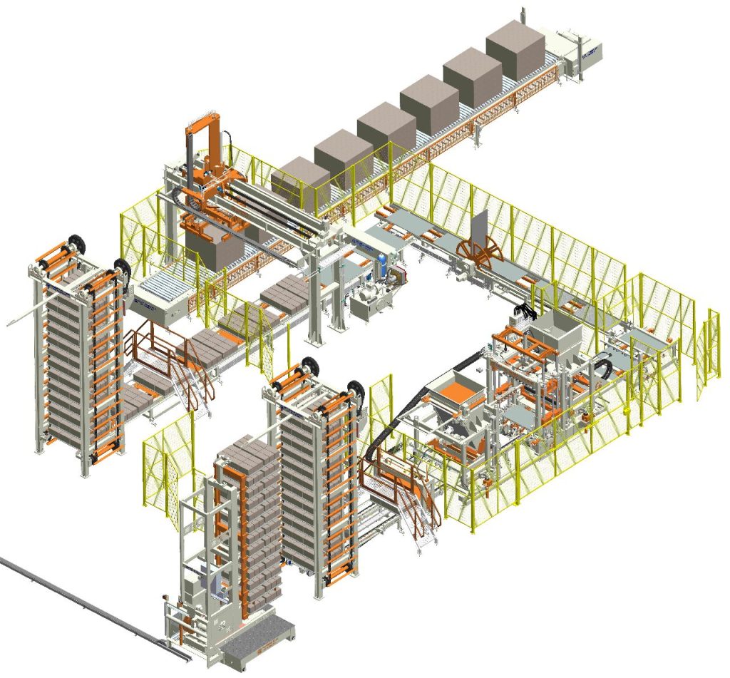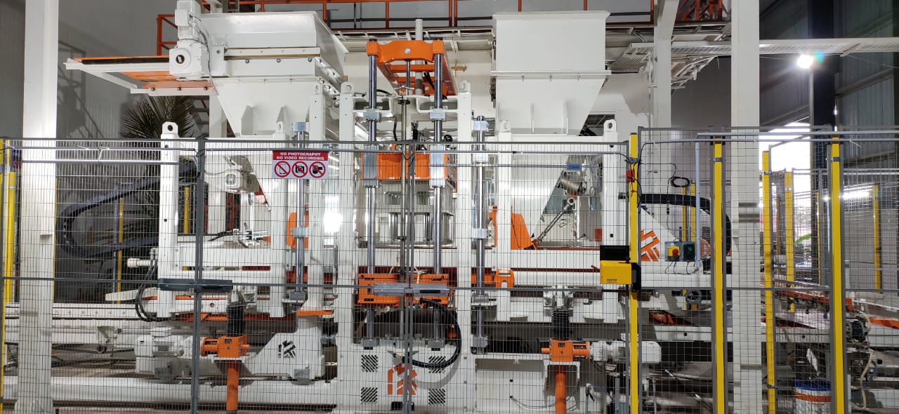 The KBT- XL is a Robust Heavy Duty 9 Block Machine, It is Suitable for High range of Production fully automatic and It is consists of advanced Electronic, Pneumatic, Hydraulic, Mechanical Components, Quick Mould Change Option Provided with Air Bellows System for Mould clamping, Mechanical Height stop for specific and accurate Height, Tamper head vibration with DC Injection Braking control, Filler Box with Agitator, Guide shaft lubrication, Wiper seals for Guide columns, Charging Frame Height adjustment Automatic Drive System and Oil Bath Eccentric Vibration System with Easy oil Drain and Filling Option. The production Height range starts from 25 mm to 300 mm Wide range of Products. It is suitable for Pavers, Slabs, Hollow Blocks, Fly ash Brick, Solid blocks, and other concrete Products. Add-on option for Color mix draws Plate for Texture Paver Production, Cross cleaner for Tamper head shoe plates cleaning, Polystyrene device (Thermal/Insulated Blocks can be Manufactured).